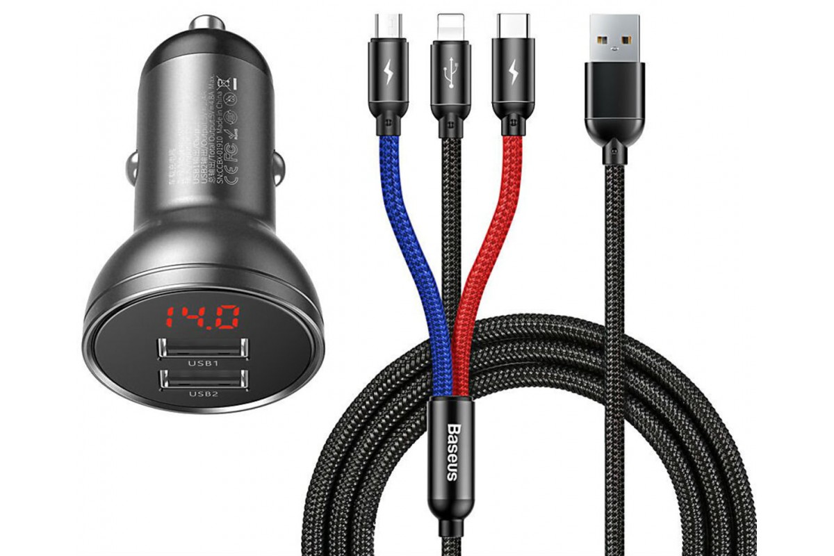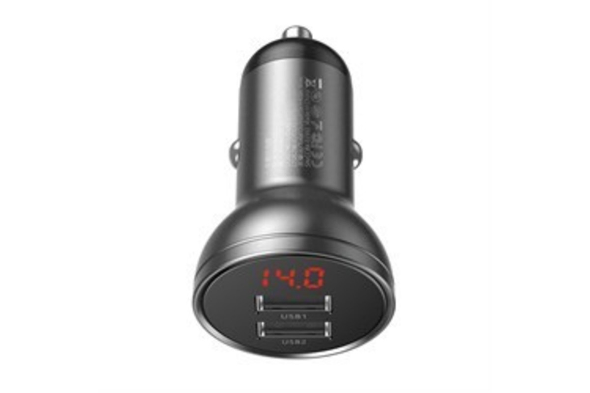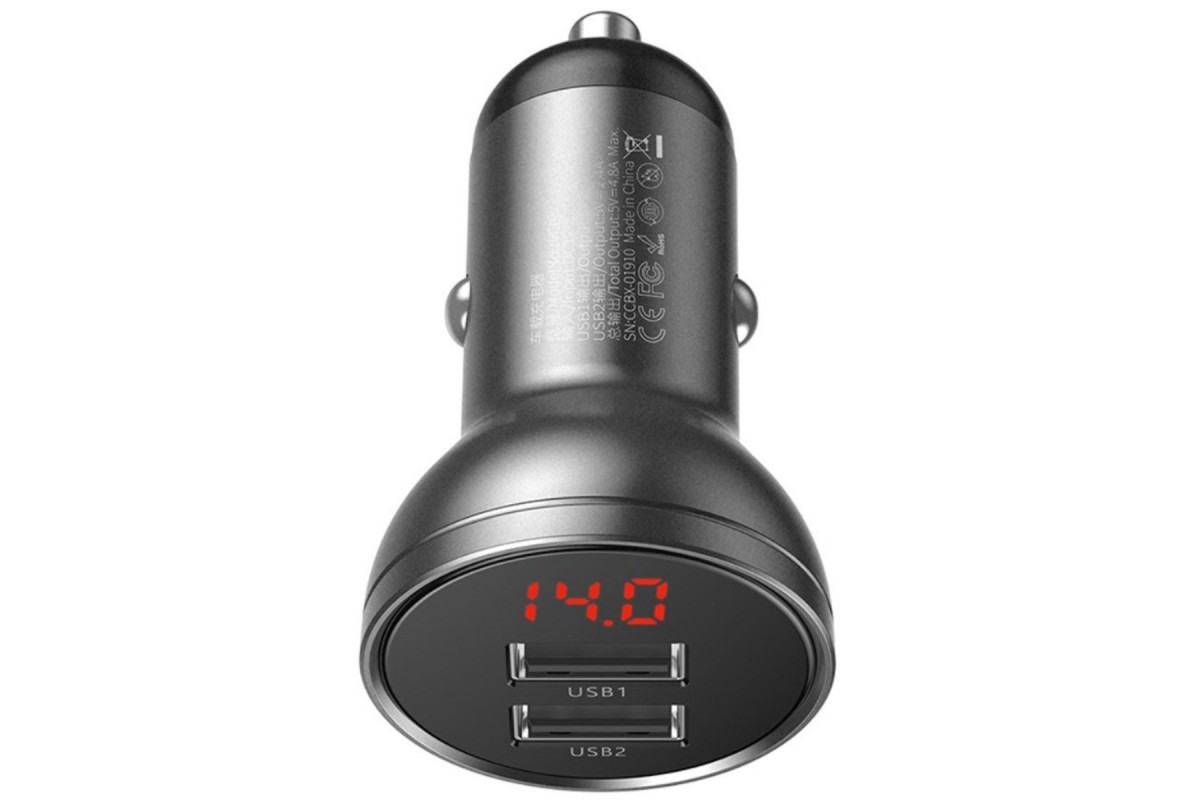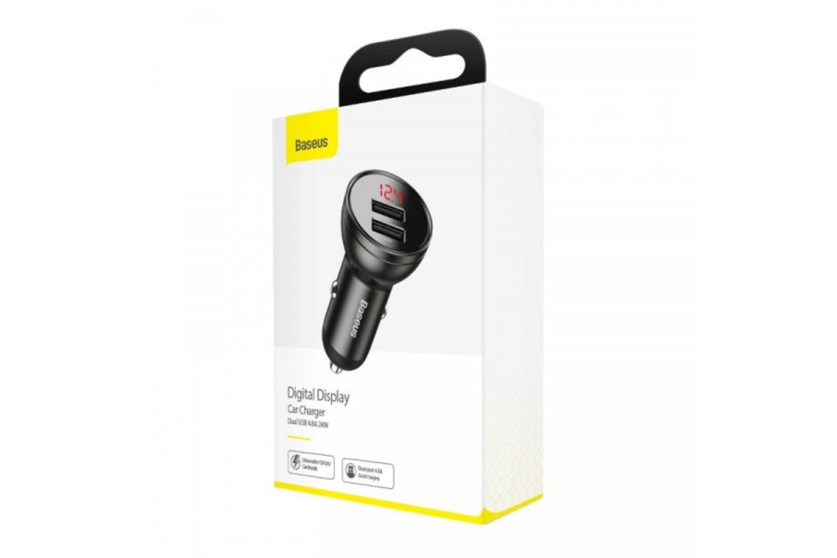 BASEUS Digital Display Dual USB 4.8A, 24W ─ мініатюрний автомобільний зарядний пристрій з дисплеєм і двома вихідними USB-портами, які працюють одночасно. Завдяки крихітним розмірами і простому дизайну відмінно впишеться в інтер'єр будь-якого автомобіля і не буде втручатися в салоні. Підтримка технології Quick Charge 3.0 забезпечить прискорену зарядку сумісних мобільних апаратів. Працює від напруги 12-24 В. Підійде для більшості існуючих типів автомобілів. Для початку зарядки адаптер вставляється в прикурювач, а потім в один з його роз'ємів ─ рідний USB-провід від телефону. Використання негорючих матеріалів і вбудована багаторівнева система захисту від стрибків напруги і короткого замикання, захист від перегріву ─ роблять використання аксесуара безпечним. Адаптер автоматично визначає оптимальні параметри, необхідні для ефективної і безпечної зарядки кожного гаджета. Аксесуар сумісний з більшістю пристроїв, для зарядки яких використовується USB-кабель.
