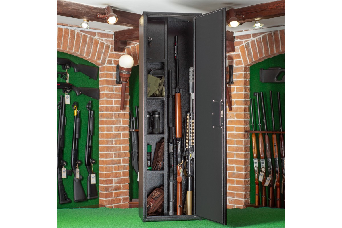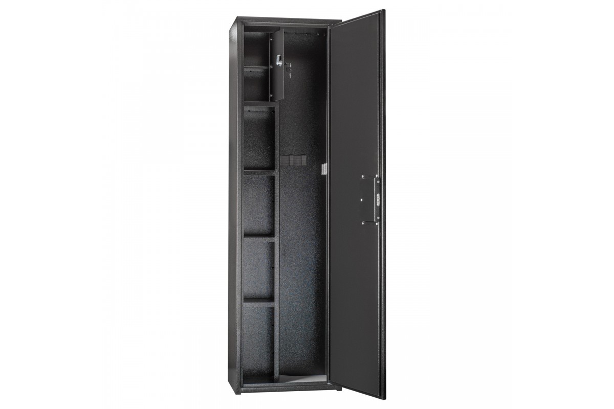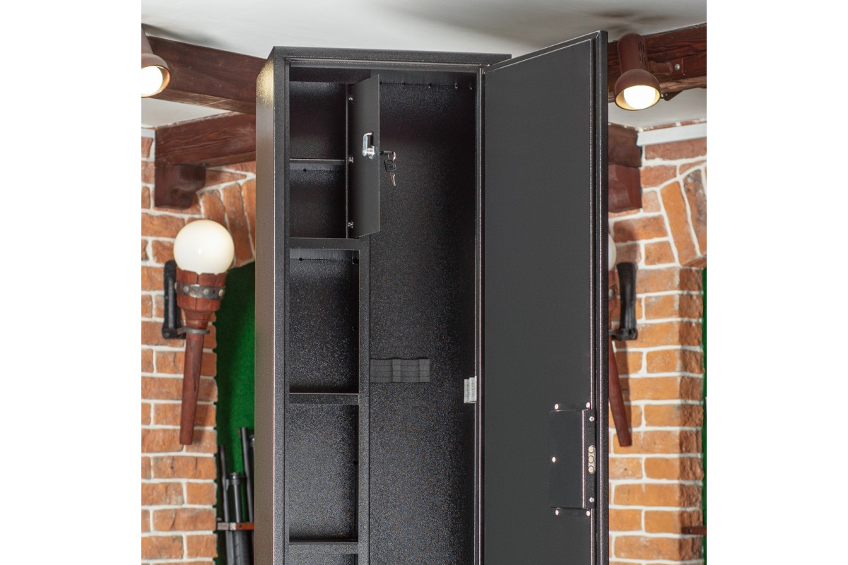 Сейф призначений для зберігання трьох вогнепальних збройових одиниць заввишки до 1370 мм, а також для патронів та додаткових аксесуарів.Він відповідає вимогам дозвільної системи: оснащений замком сувальдного типу, передбачена можливість кріплення до підлоги, та має відсік для зберігання патронів.Конструкція корпусу виготовлена зі сталі: товщина корпусу - 1,2 мм, дверна плита - 1,2 мм, а відсік для патронів - 2,0 мм. Внутрішня частина дверей закрита фальшпанеллю. Втоплені дверцята підвищують надійність сейфу, а дверний отвір посилений.Зовнішній вигляд збройного сейфу із фальшпанеллю ШОЛ-1370 підкреслюється порошковим фарбуванням, яке надає йому приємний вигляд та захищає від корозії. Колір - чорний RAL9005.Внутрішній простір сейфу поділений на дві зони: одна призначена для зберігання зброї, інша - для полиць і відділення під патрони.Для захисту ваших документів чи цінностей використовується надійний ключовий замок сувальдного типу від фірми (Титан/FZB/Barrero) з трьома ригелями діаметром 10 мм. Сейф також оснащений касовим відділенням, яке закривається замком Euro-lock, і має 2000 комбінацій для додаткової секретності.Габаритні розмірГлибина 30 смШирина 40 смВисота 140 смВага 32 кгГарантія 5 років і 12 місяців на замок