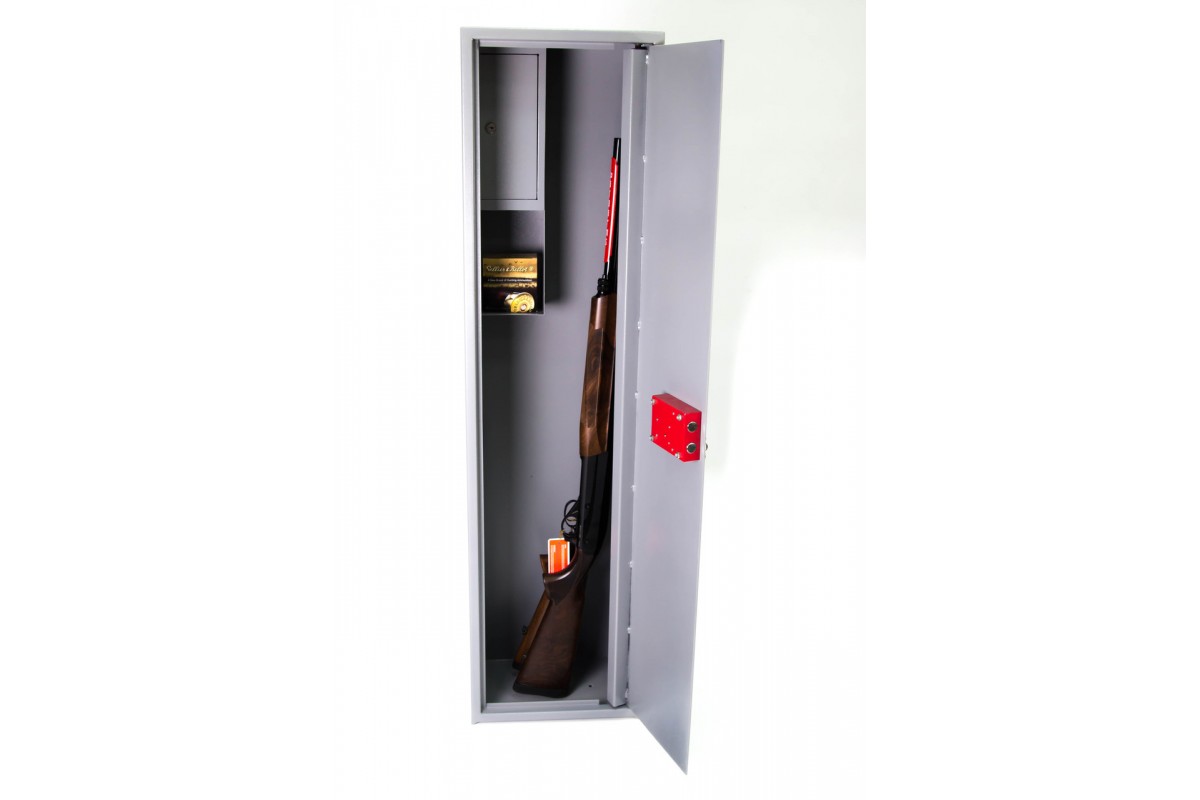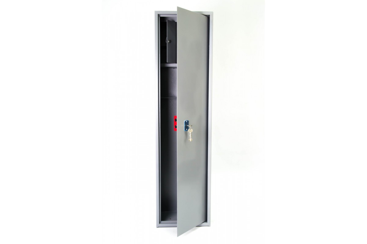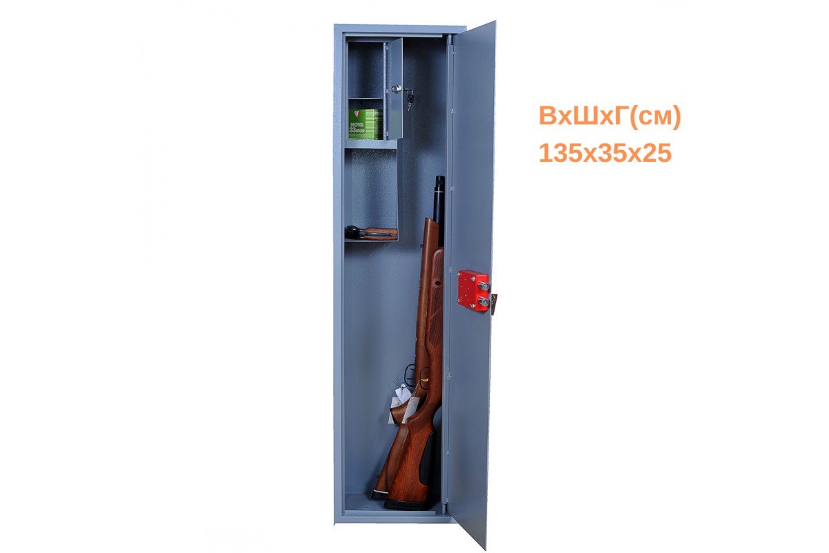 Замок КС-106 ригельного сувальдного типу володіє двома ригелями діаметром 16 мм. Сейф призначено для зберігання 2-3 вогнепальних збройових одиниць заввишки до 1320 мм та патронів, відповідаючи всім вимогам дозвільної системи. Сейф обладнано замком сувальдного типу, можливістю кріплення до підлоги, відсіком для зберігання патронів та полицею для розміщення додаткових аксесуарів.Конструкція корпусу виготовлена з листової сталі товщиною 2,0 мм для корпусу та 3,0 мм для дверної платі. Дверний отвір посилений, а втоплені дверцята сприяють підвищенню надійності сейфу.Сейф покритий порошковою фарбою, яка випікається в печі при 180 °C, що надає йому привабливий зовнішній вигляд та захищає від корозії.Надійний ключовий ригельний замок сувальдного типу КС-106 з двома ригелями діаметром 16 мм гарантує захист вмісту сейфу від сторонніх. У сейфі також розміщене касове відділення, що закривається замком Euro-lock і має 2000 комбінацій для забезпечення додаткової секретності.Габаритні розміриГлибина 25 смШирина 35 смВисота 135 смВага 40 кгГарантія 5 років і 12 місяців на замок
