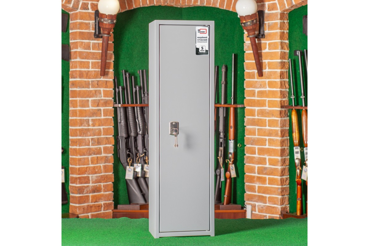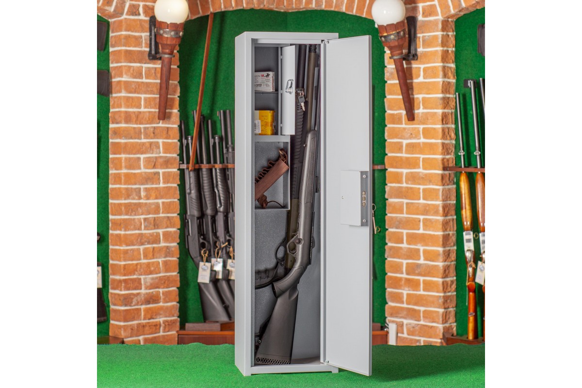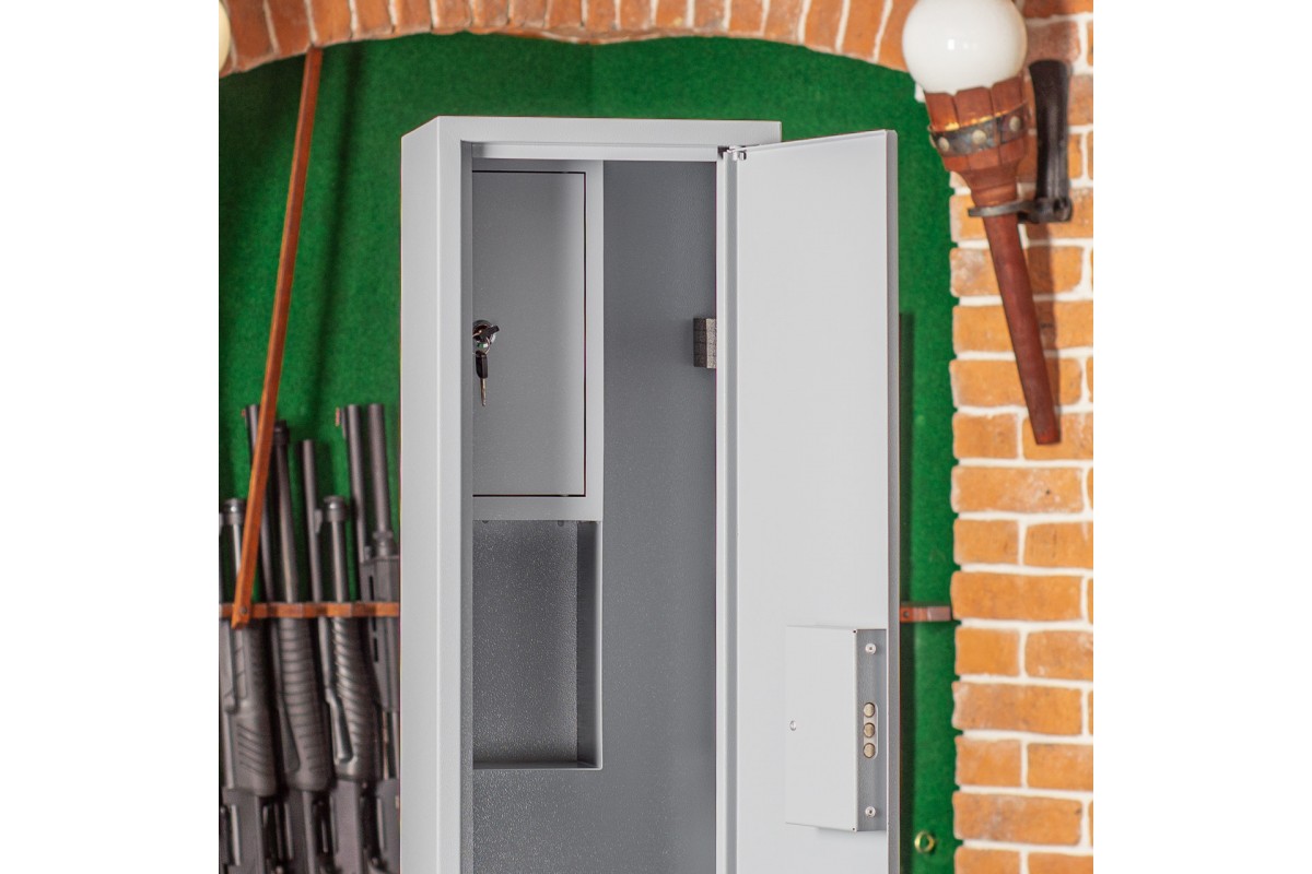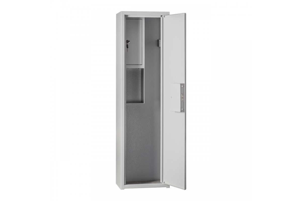 Сейф розроблено для зберігання двох вогнепальних збройових одиниць, заввишки до 970 мм, а також для патронів.Він відповідає всім вимогам дозвільної системи, має замок сувальдного типу, можливість кріплення до підлоги та відсік для зберігання патронів.Конструкція корпусу виготовлена зі сталі: корпус - 1,2 мм, дверна плита - 1,5 мм, а відсік для патронів - 2,0 мм. Дверний отвір додатково посилений. Втоплені дверцята підвищують надійність сейфу.Поверхня сейфу покрита порошковою фарбою, яка випікається в печі при 180 °C, що забезпечує приємний зовнішній вигляд і захист від корозії.Для захисту ваших документів і цінностей використовується надійний ключовий замок сувальдного типу (Титан/FZB/Barrero) з трьома ригелями діаметром 10 мм. Крім того, сейф оснащений касовим відділенням, яке закривається замком Euro-lock і має 2000 комбінацій для додаткової секретності.Габаритні розміриГлибина 20 смШирина 28 смВисота 100 смВага 15,5 кгГарантія 5 років і 12 місяців на замок