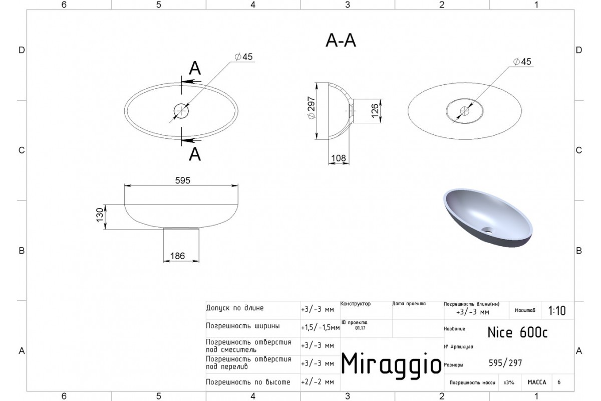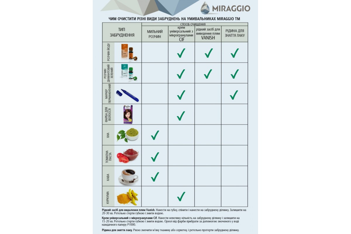 Продукція Miraggio виготовлена згідно з європейськими стандартами та пройшла перевірку на якість за кордоном. Умывальник MIRAGGIO NICE глянцевый с литого мрамора mrg_631409695-02 виготовляється з литого мармуру, за розробленою технологією MIRAMARBLE. До складу суміші входить мелений мармур та поліефірна смола, а поверхня виробу покривається санітарним гелем Gelcoat ISO NPG. У нас Ви зможете придбати інтер'єрну сантехніку - умивальники: глянсові, матові, пофарбовані по RALL; умивальники: підвісні, накладні, врізні; ванни: глянсові, матові, забарвлені по RALL; ванни: вбудовувані та окремі: душові піддони різної конфігурації та продукцію з отворами та без для вашого будинку. Умивальники; виготовлені із кварцового піску за технологією MIRASTONE. До складу суміші входить тільки кварцовий пісок, смоли та санітарні добавки. Наші умивальники не піддаються дії барвників, не вигоряють на сонці і при правильному догляді прослужать багато років. На всі вироби діє гарантія 10 років на виробничий брак. Вона не поширюється на випадки, коли клієнт знехтував правилами користування та догляду. Ви завжди можете звернутися до нас з питаннями догляду, встановлення та обміняти виріб протягом 90 днів (якщо виріб не був у користуванні та не встановлювався) + ціла упаковка.